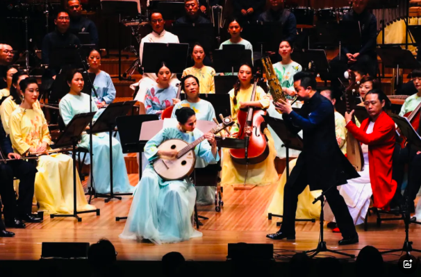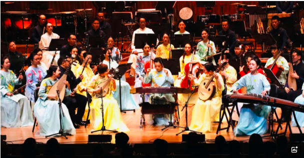 當(dāng)晚的演出由國際知名華人指揮家湯沐海執(zhí)棒,上海民族樂團(tuán)70余位演奏家一同奏響華美樂章。上半場,竹笛與樂隊(duì)《湖光》以清麗竹音勾勒西湖粼粼波光;箏與樂隊(duì)《墨戲》在旋律中鋪展中國書法的黑白意境;琵琶、京胡與樂隊(duì)《楚漢》及二胡與樂隊(duì)《臥虎藏龍》,從經(jīng)典作品中萃取意韻;嗩吶與樂隊(duì)《鳳舞》則奏響鳳凰展翅、百鳥齊鳴的熱烈圖景。下半場,五重奏與樂隊(duì)《卉木拾音》以微觀視角詮釋大國工匠精神;二胡與樂隊(duì)《查爾達(dá)什》將意大利作曲家維托里奧?蒙蒂的熱情旋律融入二胡炫技;民族管弦樂《絲綢之路》融合多元文化風(fēng)情,描繪神秘悠遠(yuǎn)的絲路勝景;民族管弦樂《共同家園》奏響共建地球家園的和諧主題;民樂重奏《蜂飛》改編自俄羅斯作曲家里姆斯基-科薩科夫的經(jīng)典,盡顯民族樂器的極速演奏技巧與藝術(shù)張力。整場音樂會(huì)在曲目編排上兼具經(jīng)典與創(chuàng)新,充分彰顯了海派民樂開放包容的藝術(shù)特色。